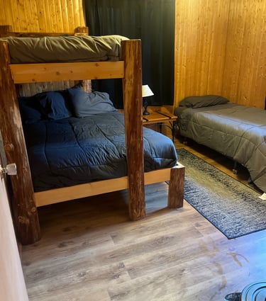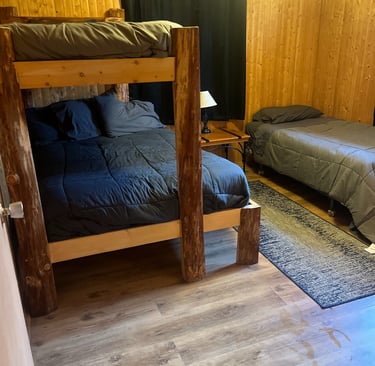 Bedroom 1: bunk-bed with a Queen on the bottom, a twin above, and another twin bed